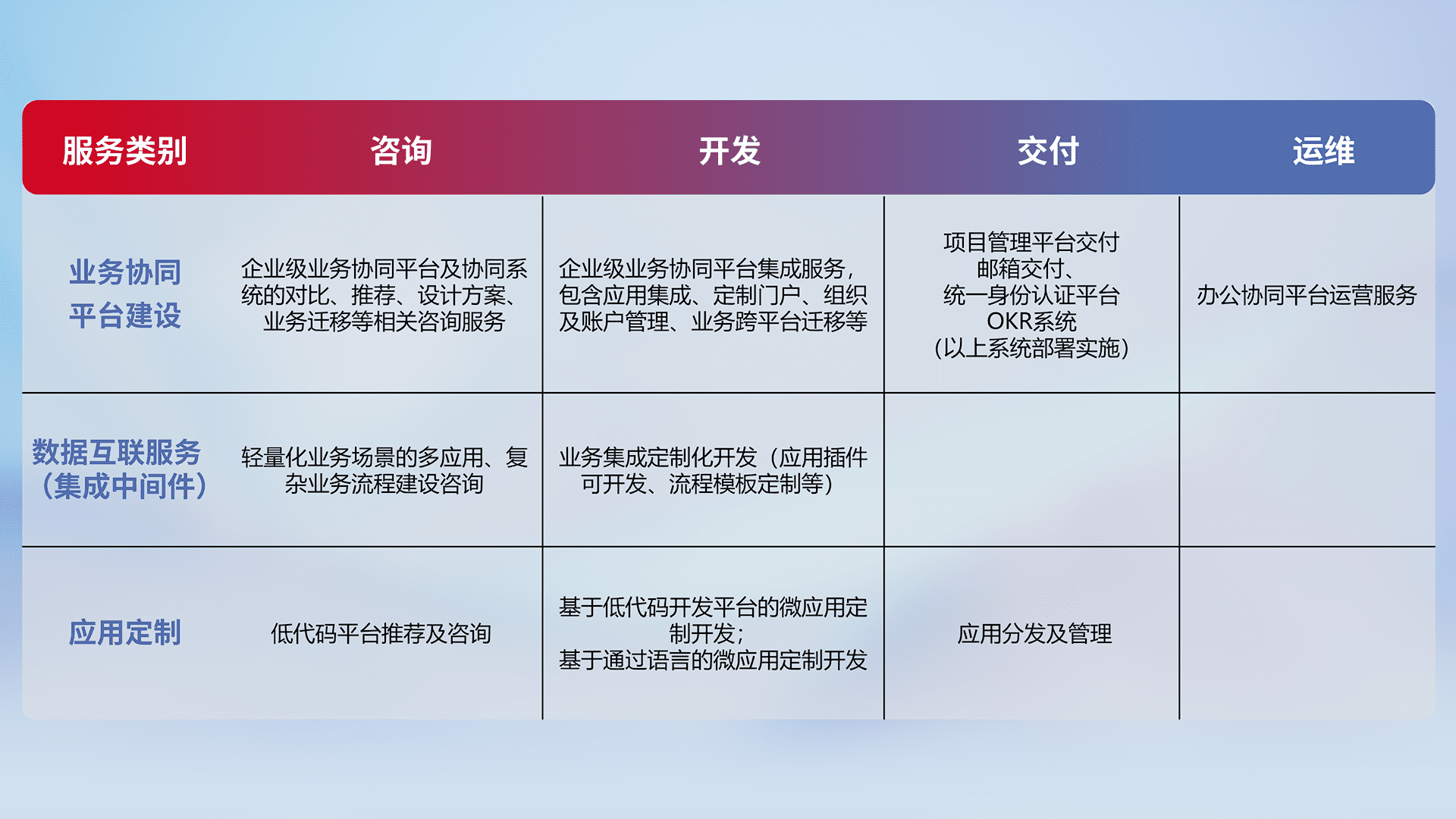 针对钉钉、、企微、、、IDaas等平台级产品提供产品的规划、、、、方案、、、交付、、、定制化开发等服务,,,实现如统一协同办公、、、、智能客户服务、、、混合会议管理、、智能数据查询、、、等业务场景,,,,实现数字化转型。。。