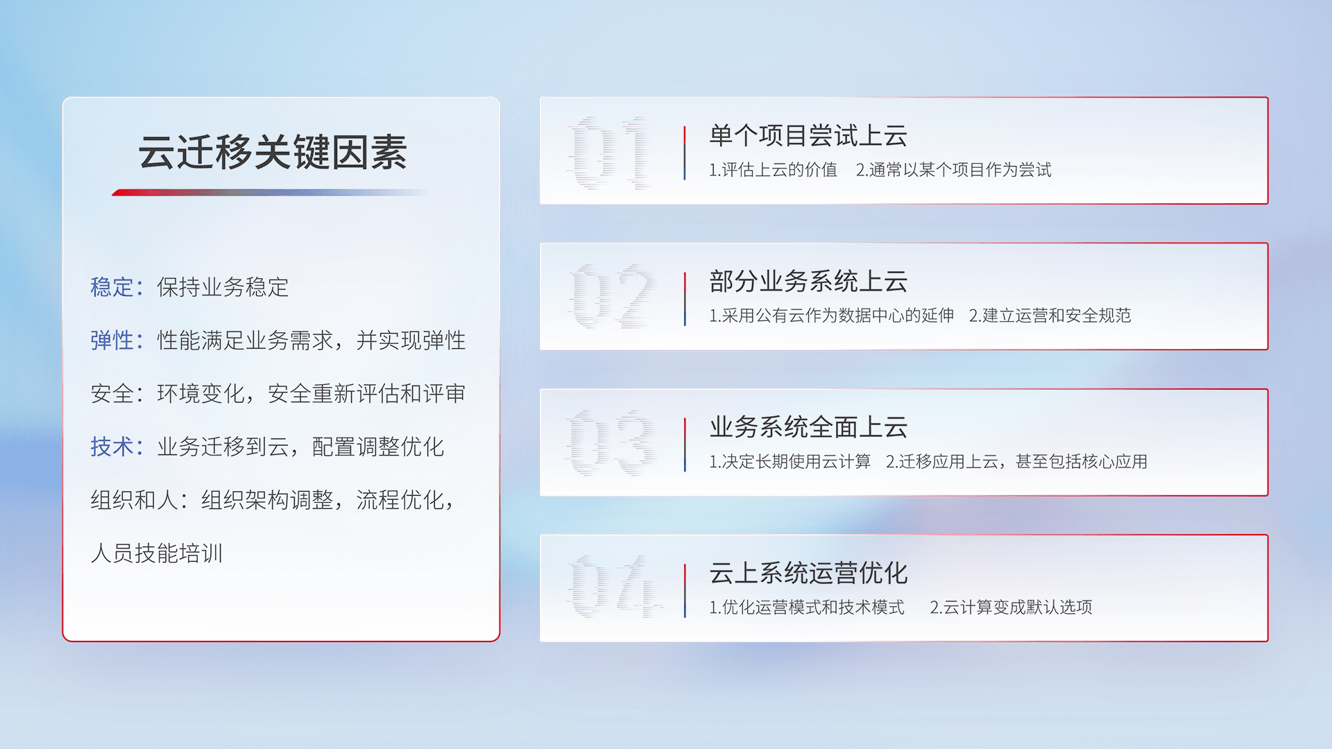 结合实际业务,,从规划设计、、云平台选型、、、云原生改造、、数据迁移、、、、集成交付,,,,迁移全过程为客户识别最佳上云路径,,,做好风险识别管理,,,,设计网络架构、、、、身份权限、、、、安全审计合规、、、操作审计、、、、日志审计、、、、监控告警策略、、、多站点容灾设计等,,,对云上基础设施进行整体规划,,提升IT治理水平,,,,以满足弹性、、、、高可用、、、、高性能的需求。。