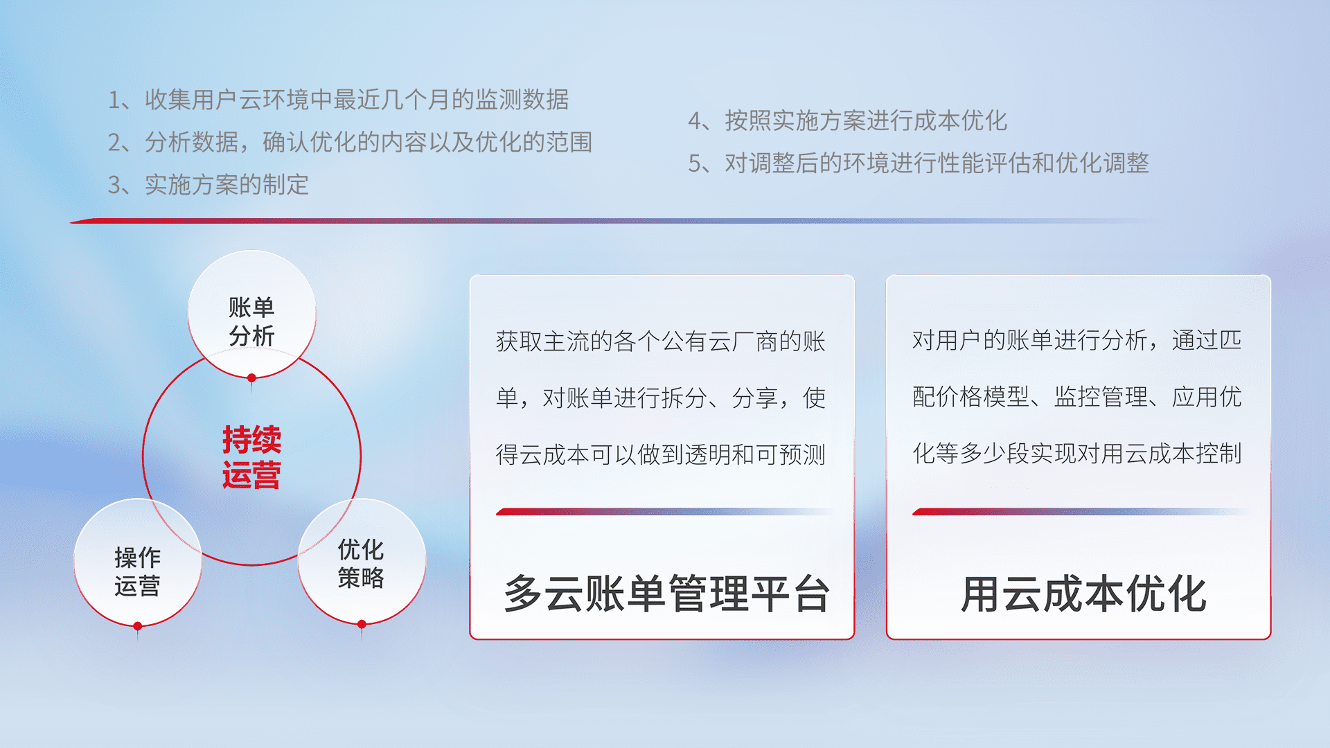 通过多云纳管,,以统一的资源数据模型把客户的云资源进行抽象和封装,,进而实现对多云资源的统一操作,,,保障云资源管理的可靠性、、、稳定性与可用性。。量身定制化运维内容,,配置、、、开发运维、、、补丁管理、、备份、、、、监控、、、认证和访问管理、、、审计和日常巡检等,,,,保障在用云过程中的可靠度,,稳定度以及高可用率。。。